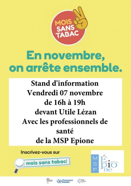 - campagne nationale Moi(s) sans tabac avec un stand d'information et de sensibilisation le 07/11 de 16h à 19h devant le magasin Utile de Lézan