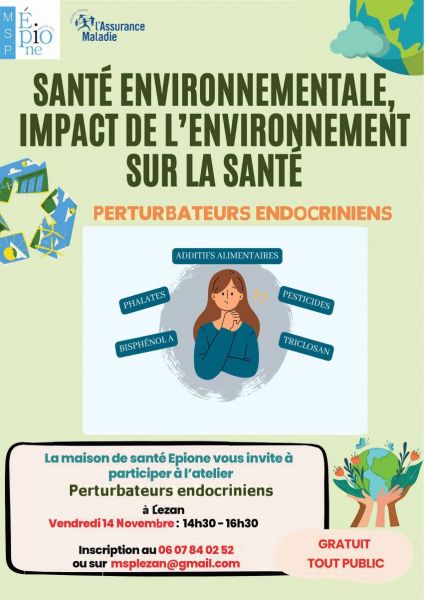- atelier participatif sur la santé environnementale et plus précisément les perturbateurs endocriniens le 14/11 de 14h30 à 16h30 au Temps partagé à Lézan.