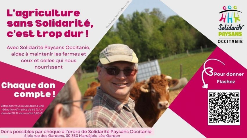 Ce défi nous concerne toutes et tous ! Soutenir les agriculteurs en difficulté à travers Solidarité Paysans Occitanie, c’est agir localement pour des paysans et paysannes qui sont à deux pas de chez nous. Offrons-leur un avenir et préservons celui de nos territoires et de nos assiettes !
